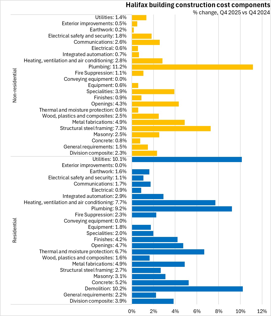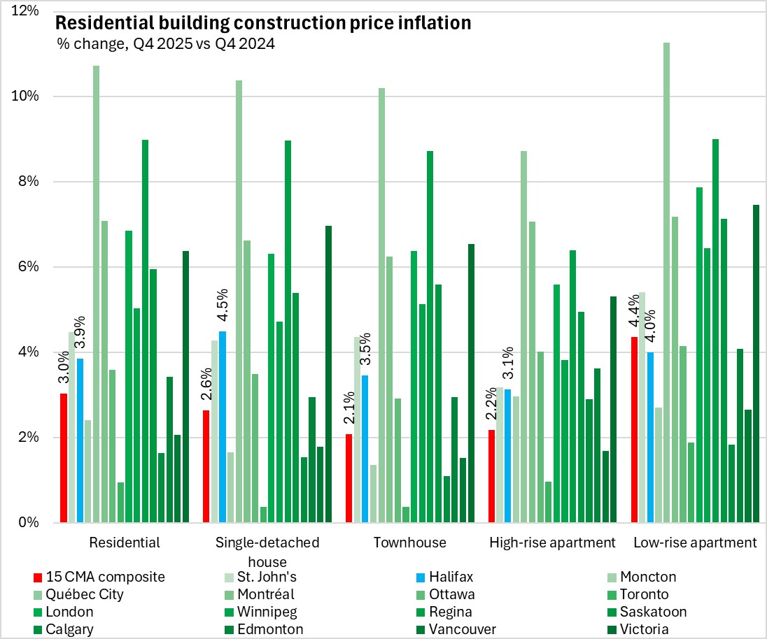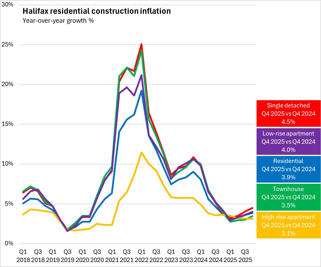 January 27, 2026BUILDING CONSTRUCTION PRICE INDEX, Q4 2025 Halifax's residential building construction prices increased by 3.9% from Q4 2024 to Q4 2025. Across Canada, residential building construction costs were up by 3.0%. Among the 15 major urban centres reported, Regina and Québec City reported the fastest rise in building construction prices. Calgary and Toronto reported the slowest increases in residential building construction costs.