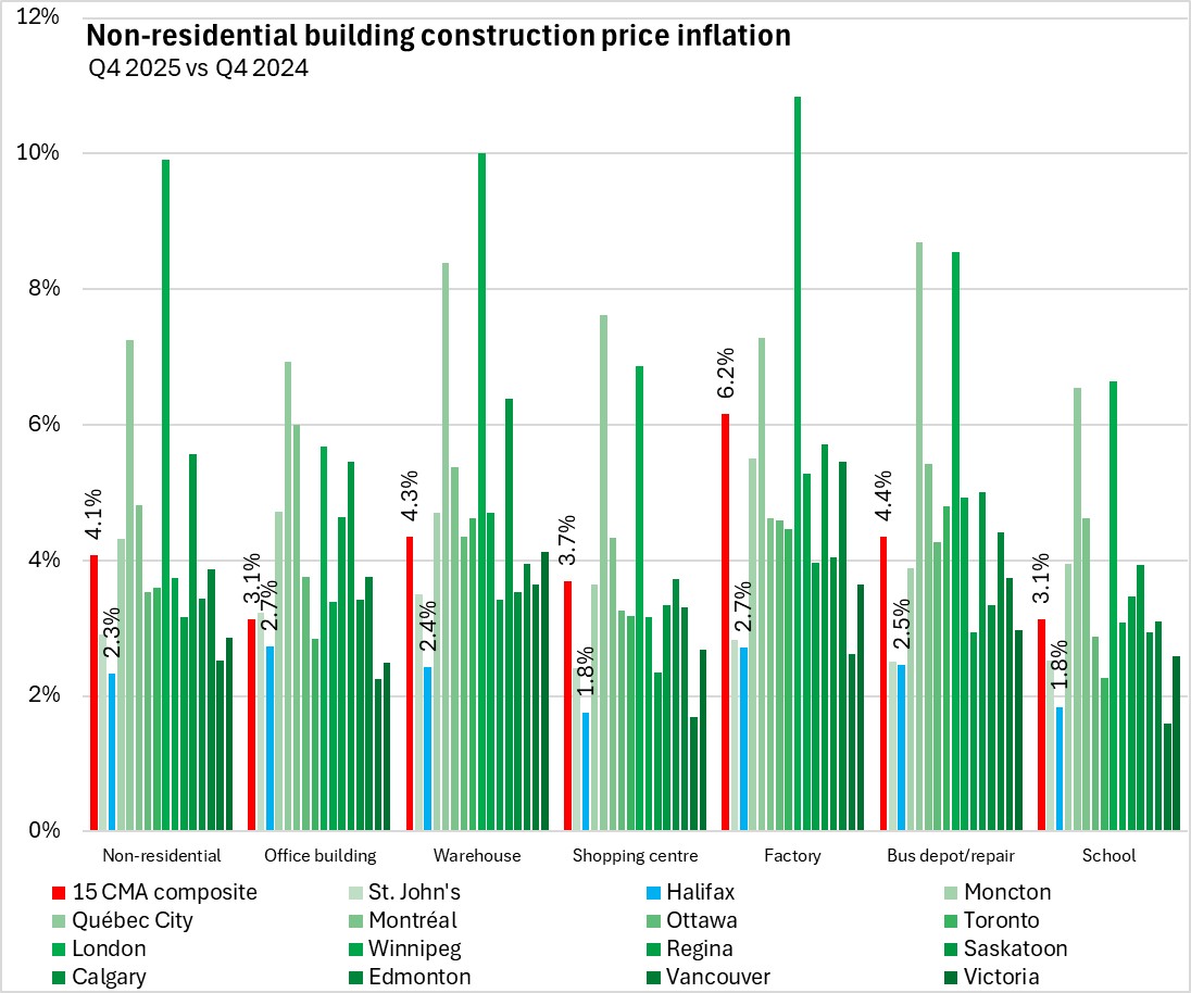 Statistics Canada Notes on the Building Construction Price Index: The building construction price indexes are quarterly series that measure the change over time in the prices that contractors charge to construct a range of commercial, institutional, industrial and residential buildings in 15 census metropolitan areas: St. John's, Halifax, Moncton, Québec City, Montréal, Ottawa–Gatineau (Ontario part), Toronto, London, Winnipeg, Regina, Saskatoon, Calgary, Edmonton, Vancouver and Victoria.