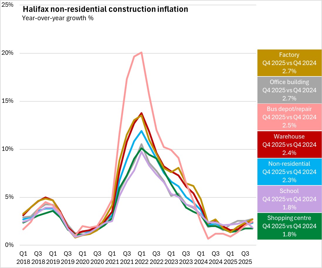 In Halifax, the pace of building cost inflation edged up for all categories of non-residential structure except shopping centers and schools. Growth was fastest for office buildings and factories while it was slower for schools and shopping centres.