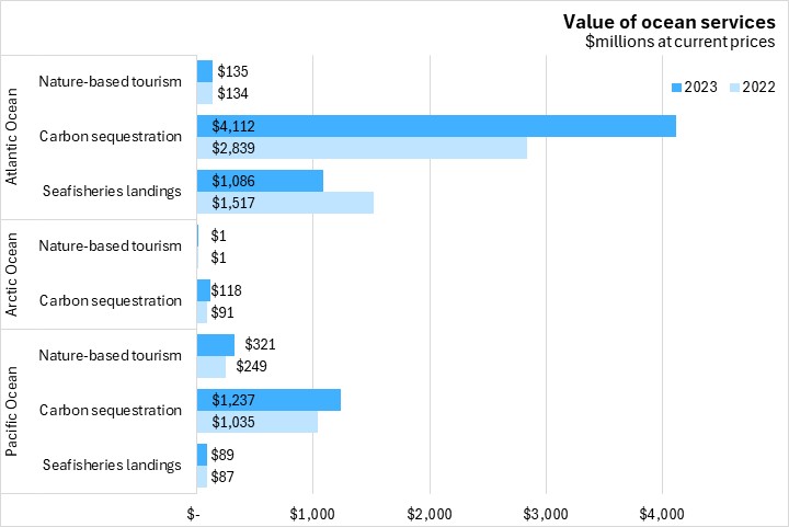 In 2023, Canadians received $7.1 billion in ecosystem services from oceans and coastal areas. Of this, carbon sequestration provided the most value in each of the three oceans bordering Canada. The Atlantic Ocean provided the most total value to Canadians, leading the country in carbon sequestration and seafisheries landings values. The Pacific Ocean provided the most nature-based tourism value. Values increased in every category in 2023 vs 2022, with the exception of a decline in seafisheries landings value in the Atlantic Ocean, and no change in nature-based tourism values in the Arctic Ocean.