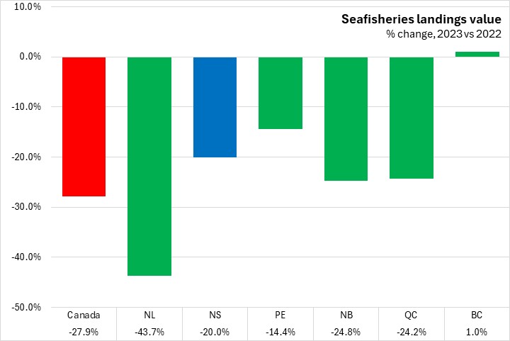 The value of Nova Scotia seafisheries landings fell 20.0% in 2023, slower than the Canadian national average decline of 27.9%. The largest decline in seafisheries landings value was reported in Newfoundland and Labrador, and the only increase in British Columbia.