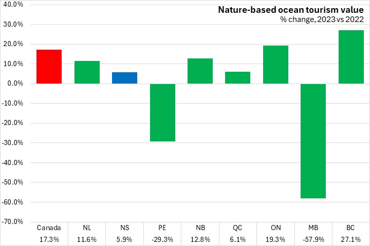Nature-based ocean tourism values increased 17.3% in Canada in 2023 compared to 2022, with the fastest growth observed in British Columbia (+27.1%), and the largest decline in Manitoba (-57.9%). The value of Nova Scotia nature-based ocean tourism increased 5.9% in 2023 vs 2022.