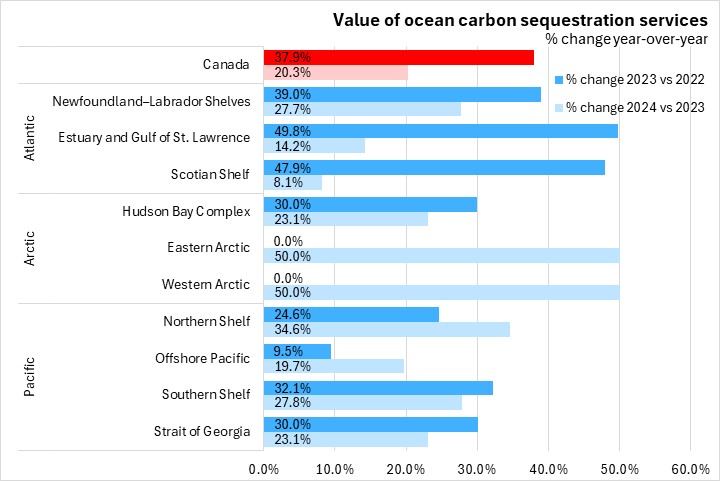 Increases in the ocean ecosystem services value Canadians receive has been primarily driven by higher estimates of carbon sequestration values. Nova Scotia carbon sequestration value from its surrounding waters (the Scotian Shelf and Estuary and Gulf of St. Lawrence) has increased 611.7% since 2018, while Canadian ocean carbon sequestration values have increased 518.9% over the same period. The estimated amount of carbon sequestered by Canada's oceans has remained relatively constant from 2018 to 2023, with increases in values reflecting higher price estimates per tonne of carbon sequestered.