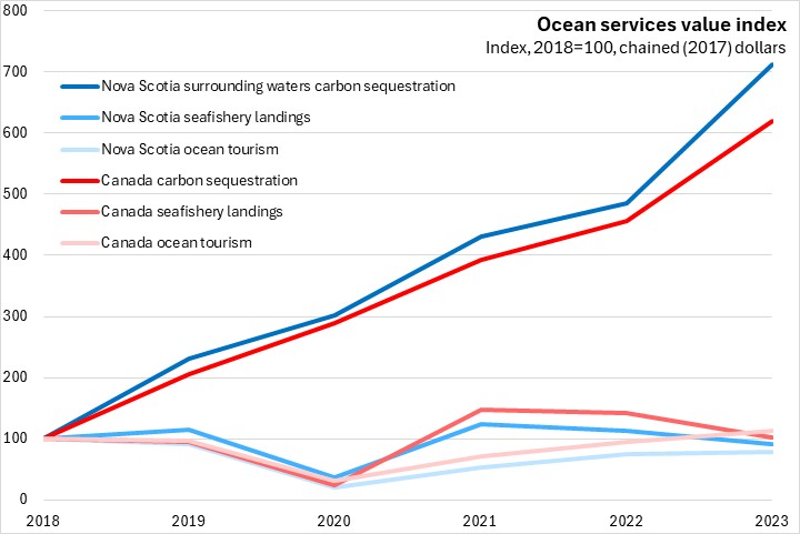 Canadian seafisheries landings (+2.2%) and ocean tourism (+12.4%) have increased since 2018, while Nova Scotia seafisheries landings (-8.9%) and ocean tourism (-21.1%) have declined.