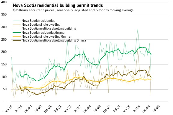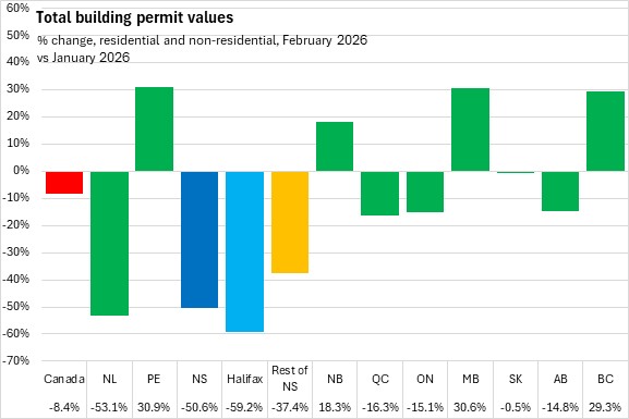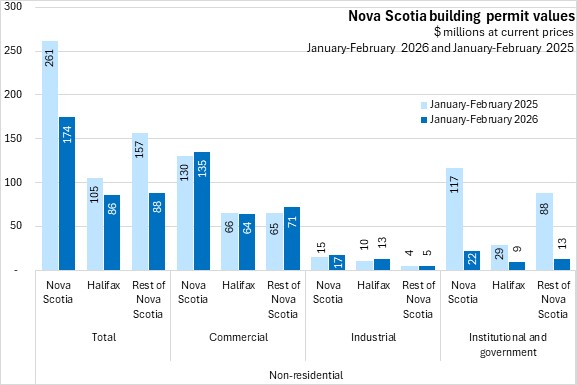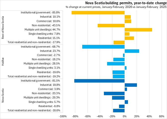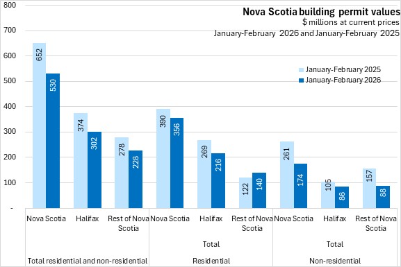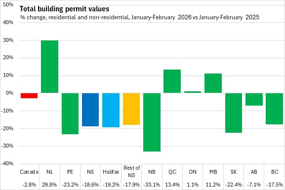 Nova Scotia's total building permits (residential and non-residential) were down 18.6% in the first two months of the year comparing with the same period in 2025. Halifax permits declined 19.2% and outside the city permit values decreased 17.9%. National permits were down 2.8%. Building permit values were down in six provinces, with New Brunswick reporting the fastest decline. Newfoundland and Labrador reported the largest gain.