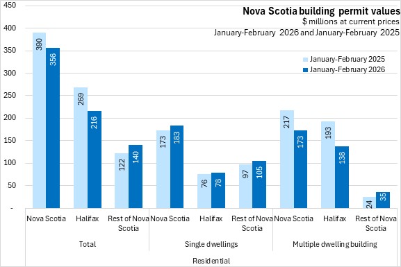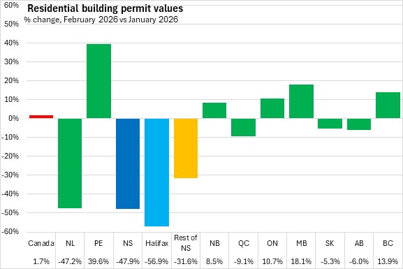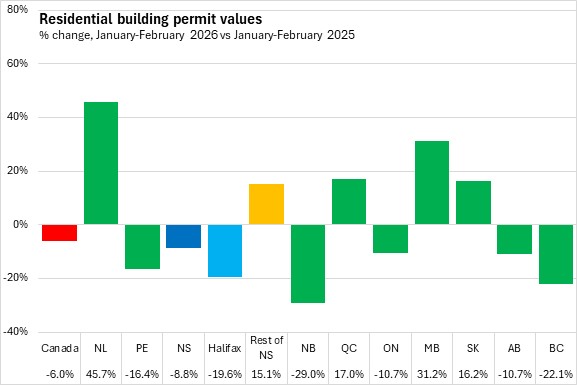 In the first two months of 2026, Nova Scotia's residential building permits fell 8.8% compared to the same period in 2025. Halifax residential permits declined 19.6% and outside the city residential permit values increased 15.1%. National residential building permit values decreased 6.0%. Residential permit values were down in six provinces, with the fastest decline in New Brunswick. The largest gain was reported in Newfoundland and Labrador.