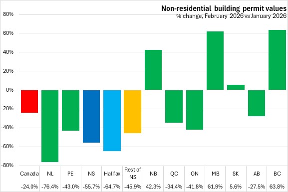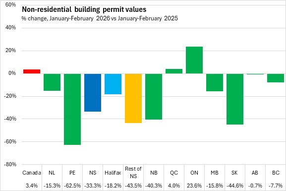Nova Scotia's non-residential building permits dropped 33.3% in the first two months of 2026 (compared with the same period in 2025). Halifax permits declined 18.2% while non-residential permits outside the city fell 43.5%. National non-residential building permit values rose 3.4%, despite declines in eight provinces. Prince Edward Island reported the steepest decline in year-to-date non-residential permit values. Ontario and Québec reported the only gains.