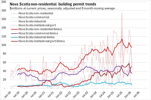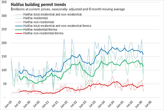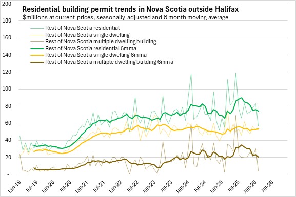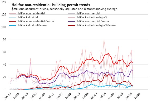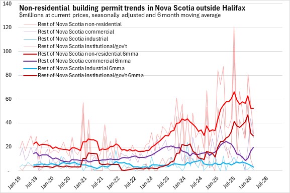 Non-residential building permits have lower values than residential permits. In Halifax, non-residential permits have increased on higher commercial and industrial projects in recent months. Outside the city, permits had a rising trend in 2025 due to sharp growth in institutional/government permits though in recent months there has been a sharp decline in institutional/government permits.