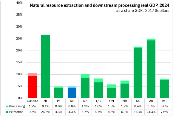 Nova Scotia natural resources sector accounted for 4.3% of real GDP in 2024. Downstream processing industries accounted for 0.6% of real GDP in 2024. The natural resources sector accounted for 9.3% of national GDP in 2024. Nationally, downstream processing sector accounted for 1.2% of real GDP. The natural resource sector accounted for over 20% of the economies of Newfoundland and Labrador, Alberta, and Saskatchewan, and less than 5% of GDP in Prince Edward Island, Nova Scotia and Ontario.