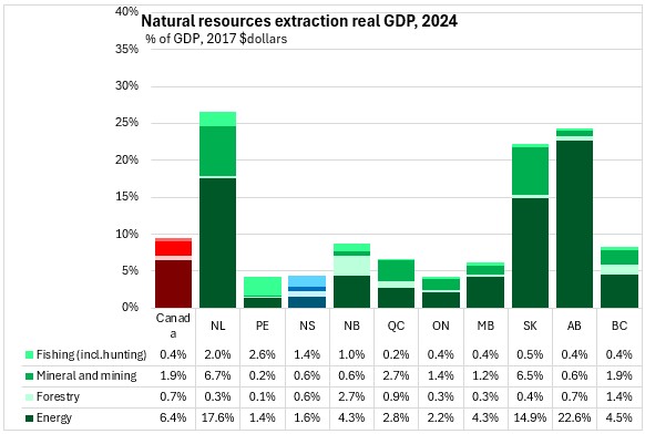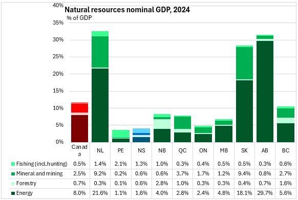 Nova Scotia natural resources sector accounted for 4.0% of nominal GDP in 2024. Nationally, natural resources sector accounted for 11.4% of nominal GDP. The natural resource sector accounted for over 30% of the economies of Newfoundland and Labrador and Alberta (over 25% for Saskatchewan), and less than 5% of GDP in Prince Edward Island, Nova Scotia and Ontario. In Nova Scotia, the contributions of natural resource sub-sectors are: energy (1.6%), forest (0.6%), mineral and mining (0.6%) and hunting, fishing and water (1.3%).