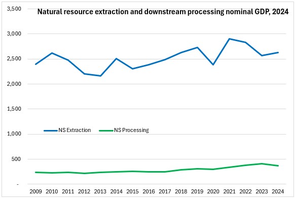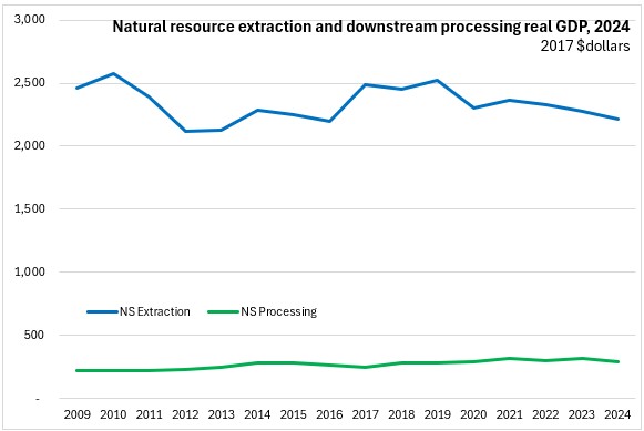 Nova Scotia natural resources real GDP declined from $2.5 billion in 2009 to $2.2 billion in 2024. Nova Scotia downstream resource processing industries real GDP gradually increased from $221 million in 2009 to $287 million.