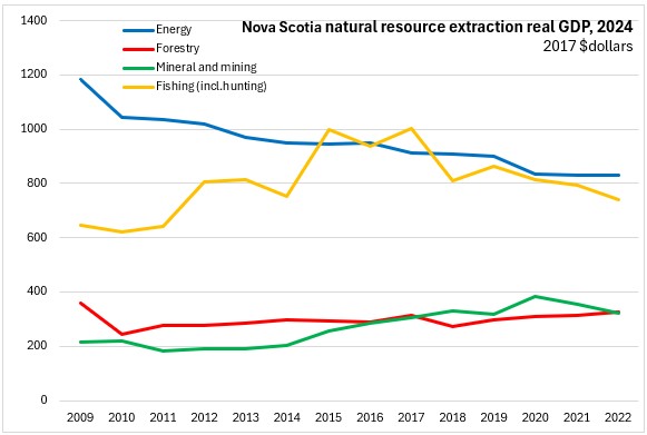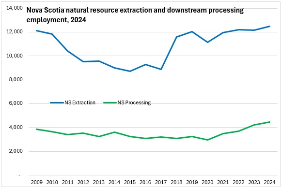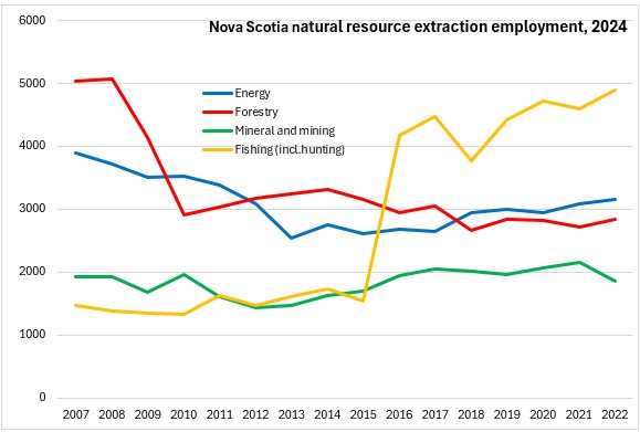Nova Scotia's employment in these natural resource industries has declined since 2009, particularly after the closure of large forest products producers (2011-2012, 2020). In recent years, natural resource industries as well as downstream processing industries employment has a rising trend. Energy employment rising modestly following a decline. In recent years, there has been growth in employment for fishing including hunting and mining/mineral extraction (except 2024).