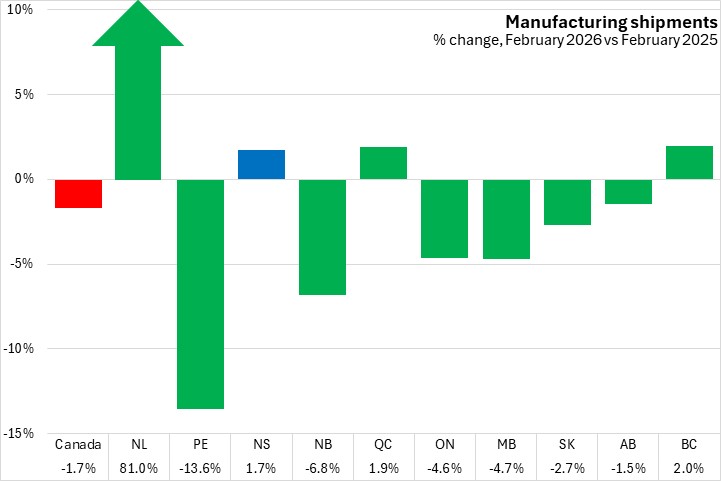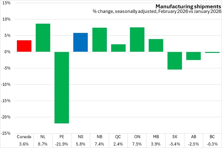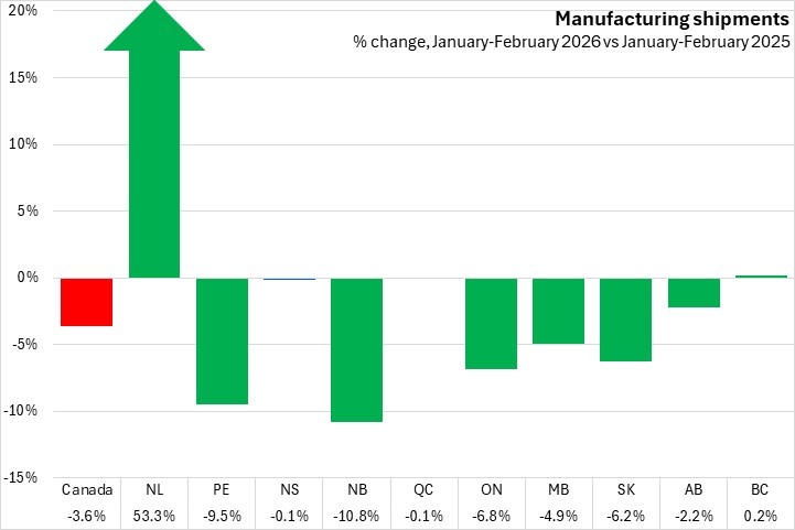Manufacturing shipments were up in six provinces, with Newfoundland and Labrador reporting the largest increase, and Prince Edward Island having the largest percentage decline among provinces from January to February 2026.