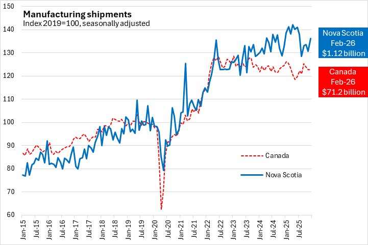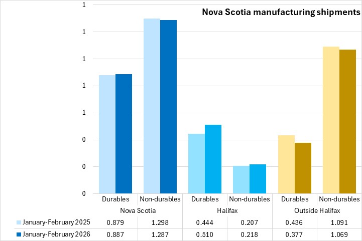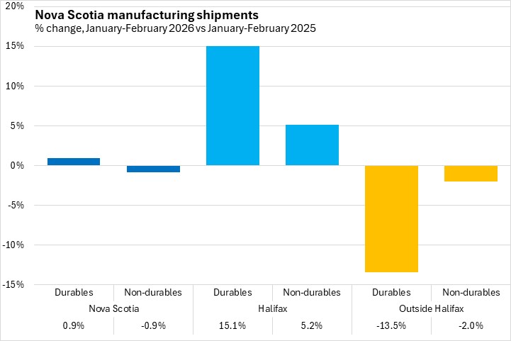 Nova Scotia durable goods manufacturing shipments were up in January-February 2026 compared with the same period in 2025, offset by a year-to-date decline in non-durable manufacturing shipments. Gains in Halifax durable good shipments were partially offset by declines in the rest of Nova Scotia, while an increase in non-durable goods shipments in Halifax was more than offset by the decline in the rest of Nova Scotia. Durable goods shipments from Halifax account for more than half of the province's durables output. The majority of Nova Scotia's non-durable manufacturing shipments come from outside the city.