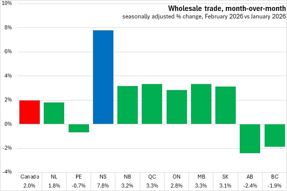 Nova Scotia wholesale trade increased by 7.8% from January to February, rising to $1.31 billion. National wholesale trade rose 2.0% to $86.77 billion. Seven provinces reported monthly growth in February led by Nova Scotia, while Alberta reported the fastest decline.