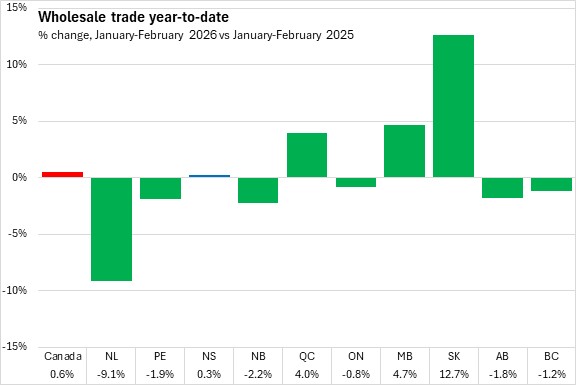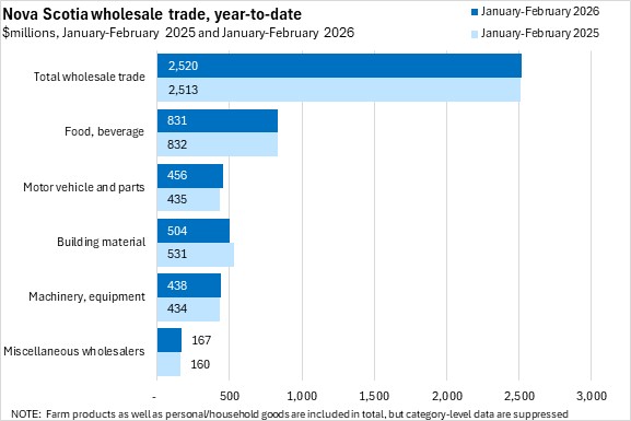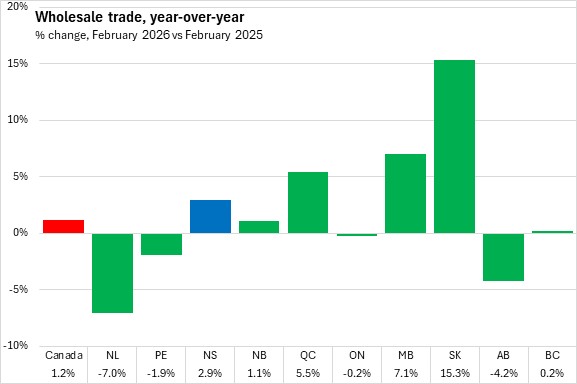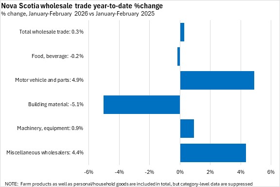 Nova Scotia's wholesale trade grew 0.3% in the first two months of 2026. National wholesale trade was up 0.6% in January-February 2026, with growth in just four provinces. Saskatchewan reported the strongest growth while Newfoundland and Labrador reported the steepest decline, year-to-date.
