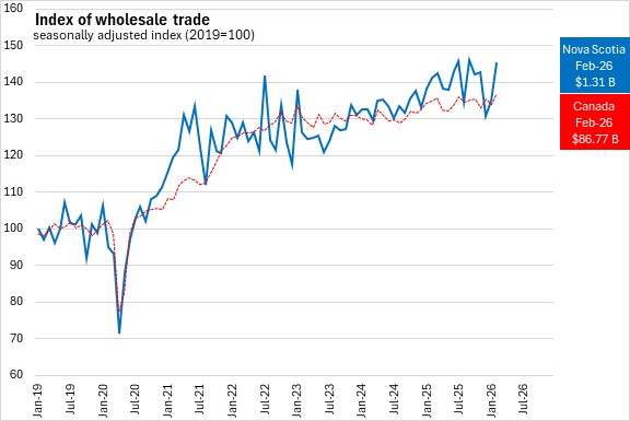 Through much of 2025 and into 2026, Nova Scotia's wholesale trade has outpaced the national average.