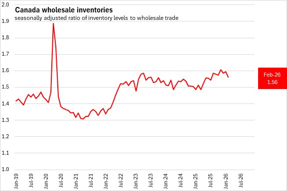 National wholesale inventories as a share of sales increased in 2025. In February 2026, the inventory-to-sales ratio declined to 1.56.