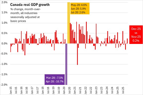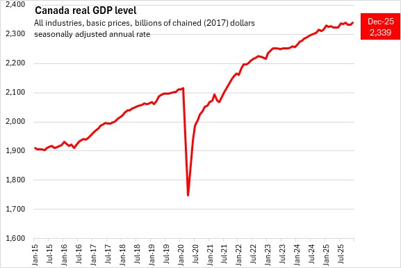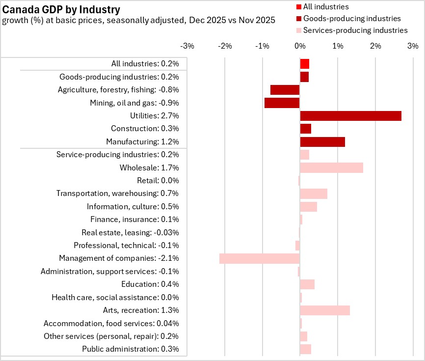 Real Gross Domestic Product (GDP) in Canada was up by 0.2% in December 2025, with gains in both goods and service producing industries.