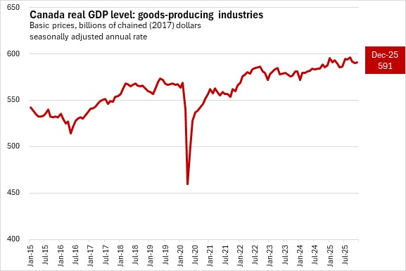 Real GDP in Canada's goods producing industries rose by 0.2% from November to December 2025.