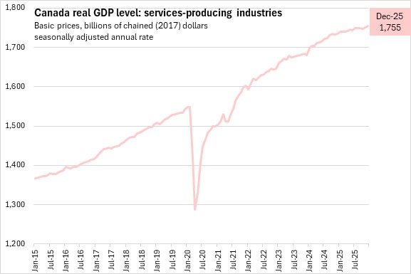 Real GDP in Canada's services-producing industries rose 0.2% from November to December 2025.