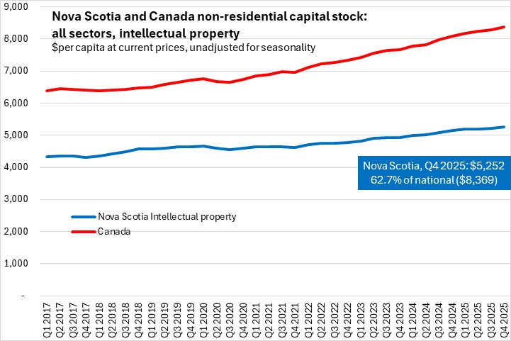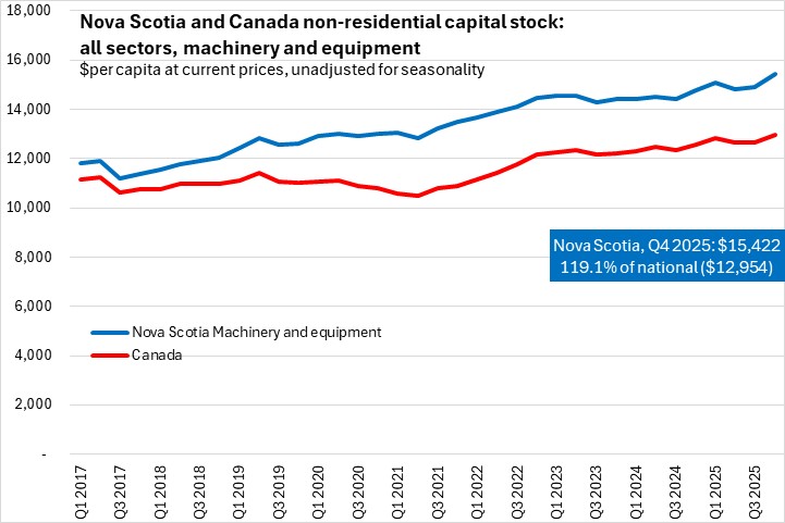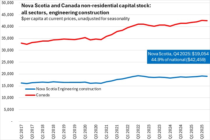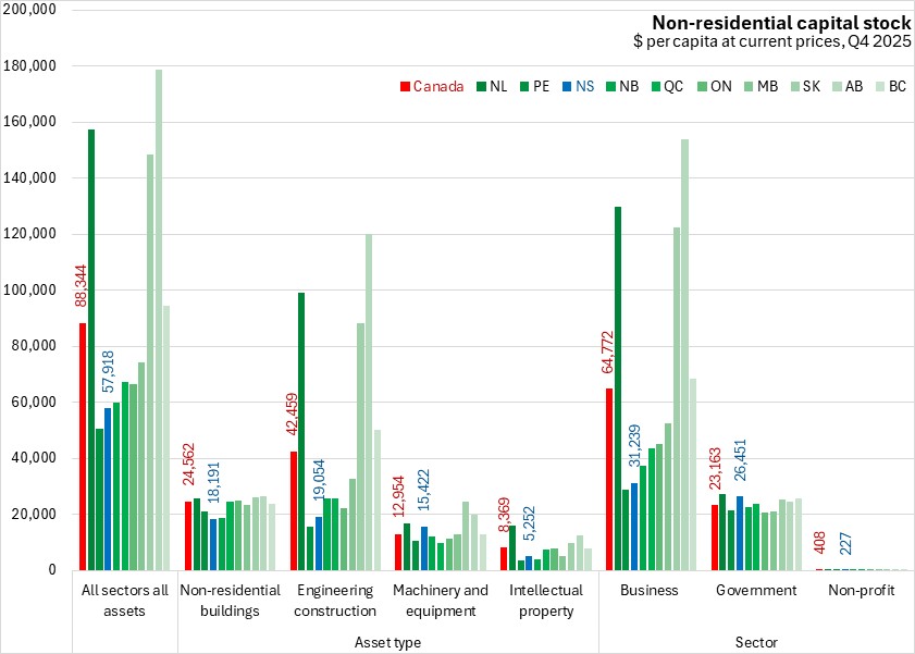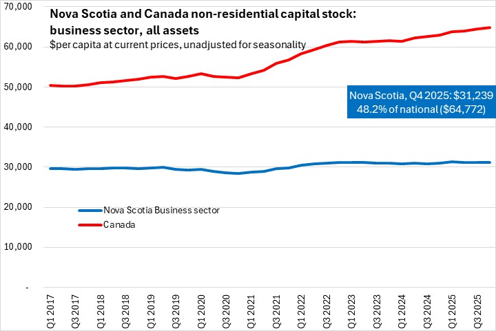 Nova Scotia's net capital stock (based on geometric depreciation) was $57,918 per capita as of Q4 2025. This was 65.6% of the national per capita capital stock. Capital stock per capita was notably higher for Canada's major natural resource regions: Newfoundland and Labrador, Saskatchewan and Alberta.