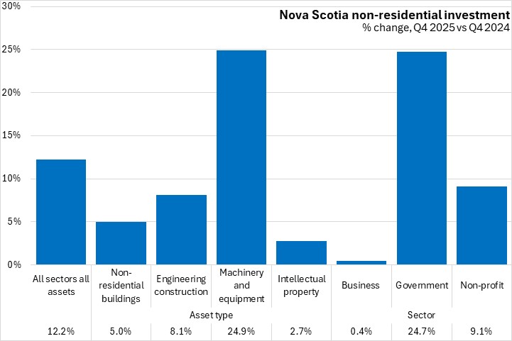 Nova Scotia's annual non-residential investment growth outpaced the national averages for all asset categories, led by machinery and equipment and engineering construction.