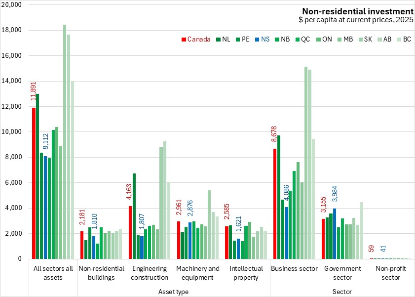 On a per capita basis, Nova Scotia's investment in non-residential assets amounted to $2,242 or 72.4% of the national per capita value. Nova Scotia's per capita investments were notably stronger than the national average for the government sector due to strength in government machinery and equipment. On average, investment per capita in all asset categories was lower than the national average.