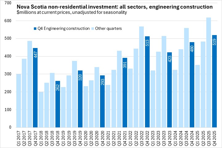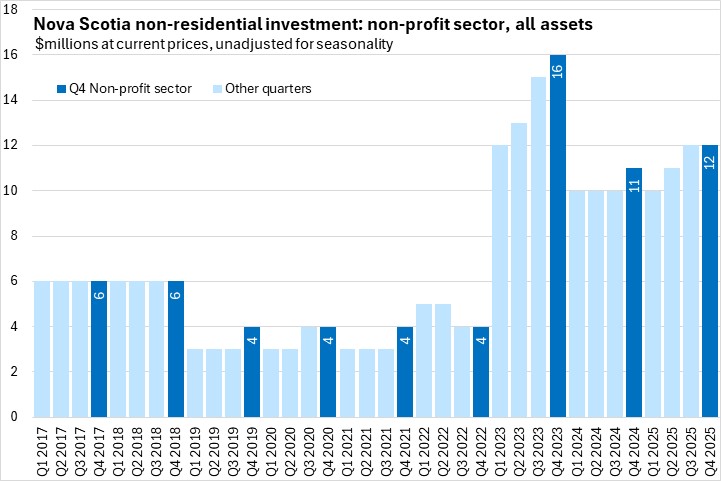 Nova Scotia non-residential investment (all sectors, all assets, current prices) rose by 12.2% from Q4 2024 to Q4 2025, leading all provinces in investment growth following growth of 7.4% in the previous quarter. Nationally non-residential investment was up 4.6% with gains in all provinces. The slowest growth in investment was reported in Saskatchewan.