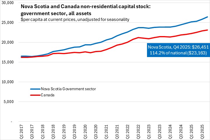Nova Scotia's $26,451 capital stock per capita in the government sector (including military hardware) was substantially higher than the national average of $23,163 per capita.