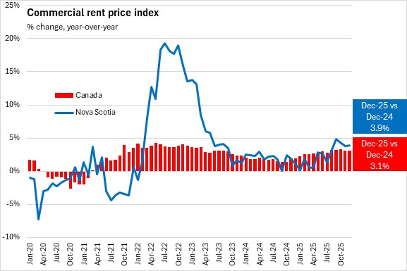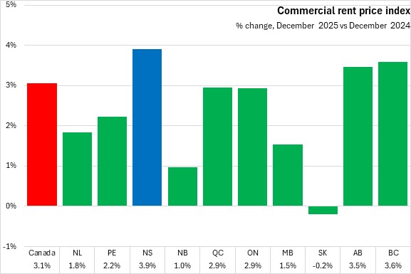 From December 2024 to December 2025, the commercial rent price index for Nova Scotia increased by 3.9%, the fastest increase among provinces. Nationally commercial rents were up 3.1%. All provinces except Saskatchewan reported higher commercial rents compared to one year ago.