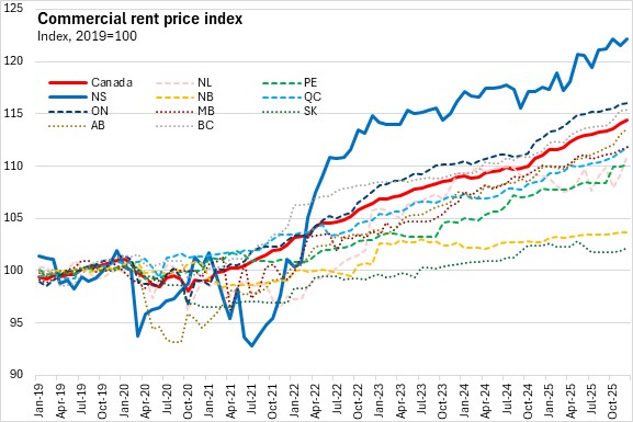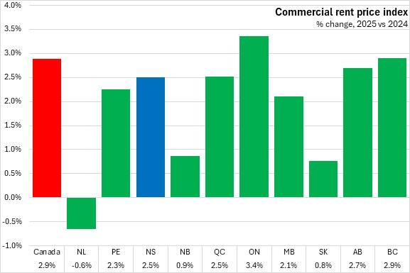 Comparing the commercial rent price index for 2025 with 2024, Nova Scotia's commercial rents were up 2.5%. The national increase in commercial rents was 2.9% with gains in all provinces except Newfoundland and Labrador, with the fastest rise in Ontario.