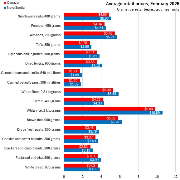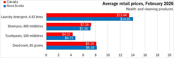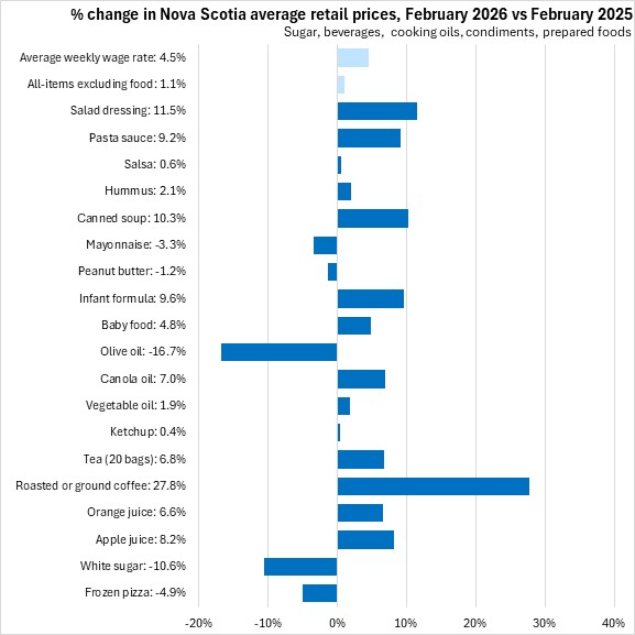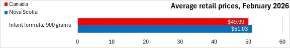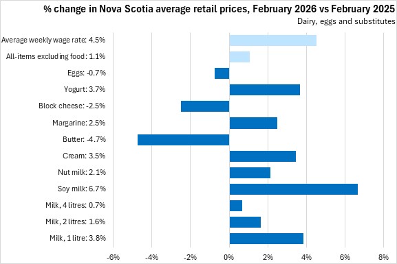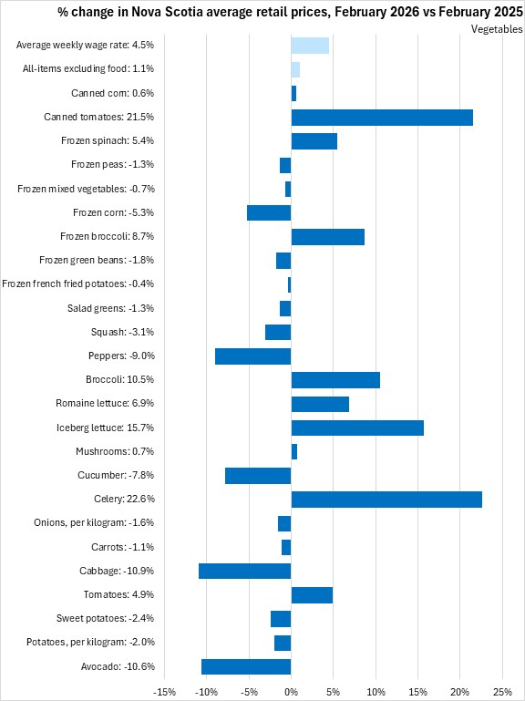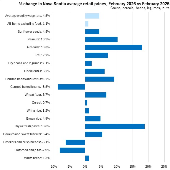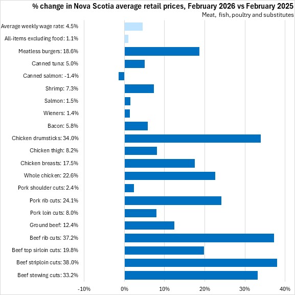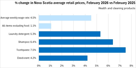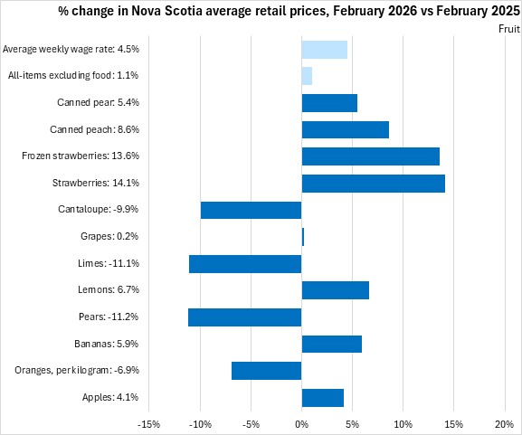 Over the last year (February 2026 vs February 2025), the consumer price index for all items in Nova Scotia excluding food increased by 1.1%. Food prices as a whole rose 5.2% (influenced by the effects of temporary HST relief on food purchased from restaurants that was in place for part of February 2025 but not February 2026). At the same time average weekly earnings across all Nova Scotia industries increased by 4.5%.