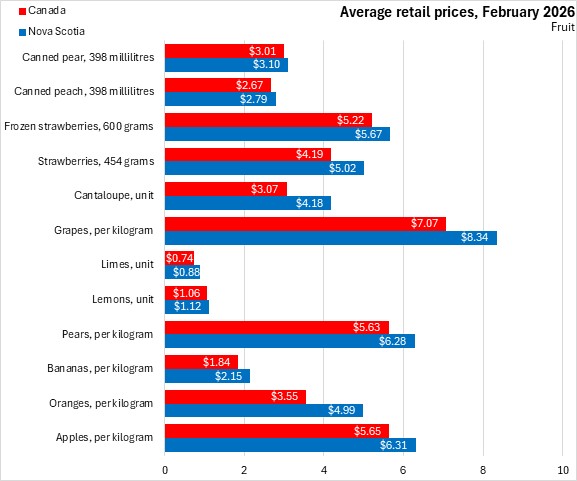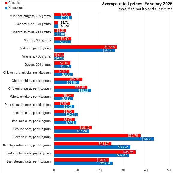 Nova Scotia food prices were more than 10% higher than the national averages for the following products: beef top sirloin cuts, beef rib cuts, pork rib cuts, pork shoulder cuts, chicken breasts, chicken drumsticks, cream, eggs, apples, oranges, per kilogram, bananas, pears, limes, grapes, cantaloupe, strawberries, sweet potatoes, tomatoes, onions, per kilogram, mushrooms, broccoli, flatbread and pita, wheat flour, vegetable oil, canola oil, canned beans and lentils, dried lentils.