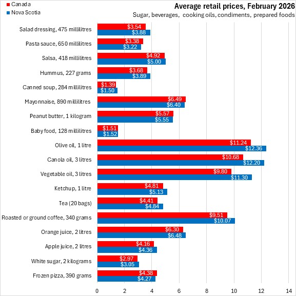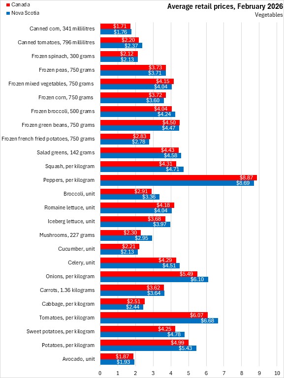 In the last year, the following products reported lower prices in Nova Scotia: canned salmon, butter, block cheese, eggs, oranges, per kilogram, pears, limes, cantaloupe, avocado, potatoes, per kilogram, sweet potatoes, cabbage, carrots, onions, per kilogram, cucumber, peppers, squash, salad greens, frozen french fried potatoes, frozen green beans, frozen corn, frozen mixed vegetables, frozen peas, frozen pizza, flatbread and pita, crackers and crisp breads, white sugar, olive oil, peanut butter, mayonnaise, canned baked beans.