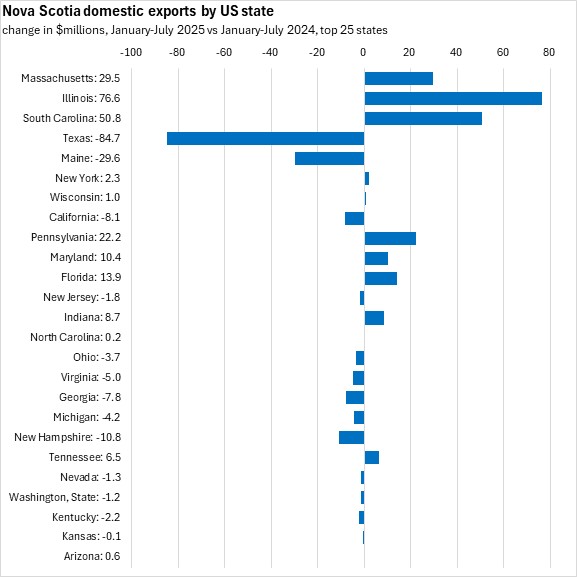 Nova Scotia's exports to the US accounted for 70.5% of exports in January-July 2025. Massachusetts, Illinois, and South Carolina each had a larger export value than Nova Scotia's shipments to China in the first seven months of 2025. Exports were up for seven of Nova Scotia's top ten US state destinations; exports were down to Texas, Maine, California. The largest dollar value increases were for Illinois, South Carolina, and Massachusetts.