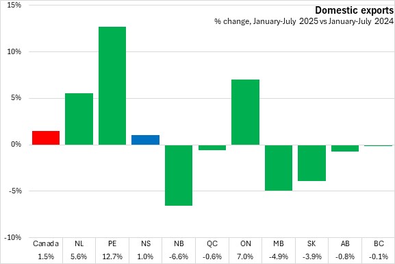 In the first seven months of 2025 domestic exports grew 1.0% in Nova Scotia compared to the same period in 2024. Canada's exports increased 1.5% for January-July 2025, with six provinces reporting declines. Prince Edward Island reported the largest gain while New Brunswick reported the steepest decline.