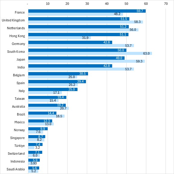 Among the other significant export destinations, year-to-date exports were up sharply to Hong Kong. There were also notably large percentage gains in exports to Italy, Indonesia and Türkiye, though these started from very low values in 2024. The largest declines in year-to-date exports were to China, South Korea, Germany, India, Japan and Brazil.