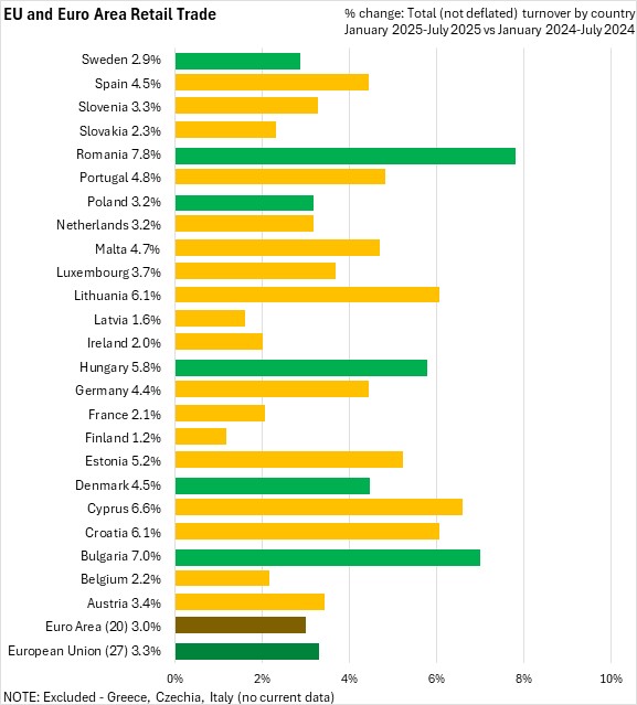 By member state (where data is available) the strongest growth in year-to-date retail sales occurred in Romania, Bulgaria, and Cyprus. The slowest gains were reported in Finland and Latvia.
