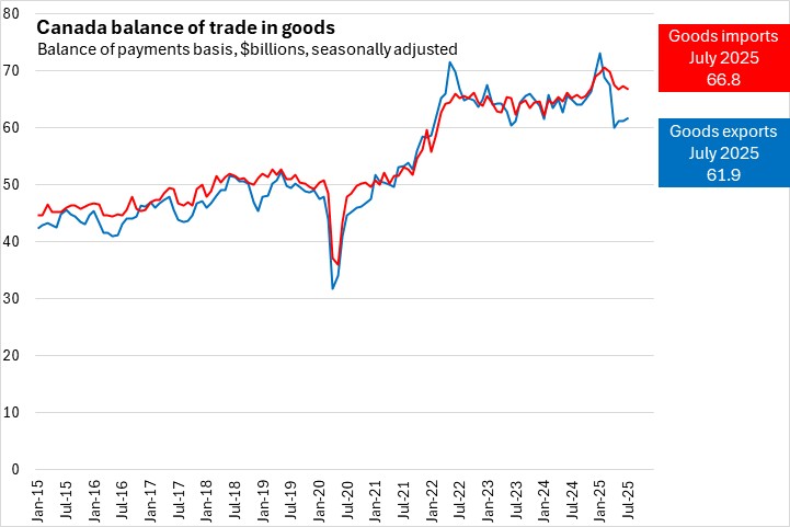 Exports of goods increased for the third consecutive month, as monthly declines from February-April coincided with the implementation of tariffs on imports of Canadian goods into the United States. Exports were up for seven of eleven product sections, led by exports of energy products and motor vehicles/parts. Canada's imports of goods declined as imports of industrial machinery/equipment/parts fell following a one-time high-value shipment in June.