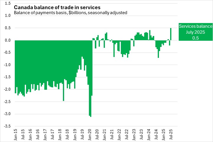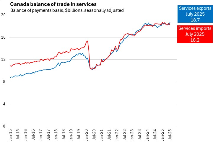Canada's international exports of services rose by 2.6% from the previous month to $18.7 billion in July 2025. Canada's imports of services fell by 1.3% to $18.2 billion. Canada's services trade deficit of $209.0 million in June 2025 narrowed by $713.0 million, becoming a surplus of $504.0 million.