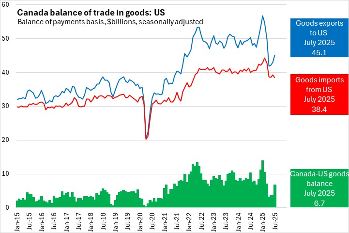 Significant changes in US tariff policy led to a pre-tariff increase in Canadian goods exports to the US (building inventories of goods before tariffs take effect), followed by a sharp post-tariff decline. Retaliatory measures and changes in consumer preferences have also influenced Canadian imports of goods from the US. Exports of goods to the United States from Canada increased 5.0% to $45.1 billion in July 2025 while imports of goods from the US decreased 2.2% to $38.4 billion. Canada's trade surplus in goods with the US widened by $3.0 billion to $6.7 billion in July 2025.