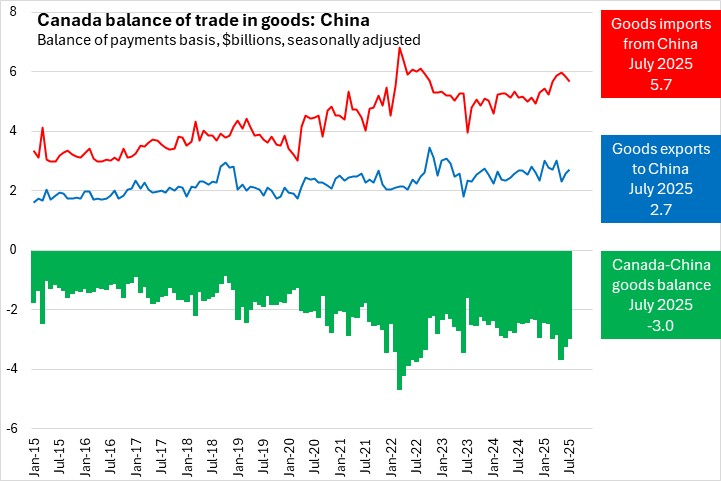 Canada's exports of goods to China increased 4.3% to $2.7 billion in July 2025. Canada's imports of goods from China fell 3.0% to $5.7 billion. Canada's deficit in goods trade with China narrowed by $289.5 million to $3.0 billion.