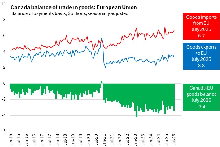 In July 2025, Canada's exports of goods to the European Union fell 8.2% to $3.3 billion. Canada's imports of goods from the EU rose 3.7% to $6.7 billion. Canada's deficit in goods trade with the EU widened by $531.4 million to $3.4 billion.