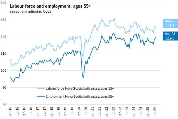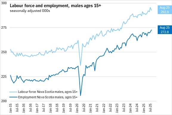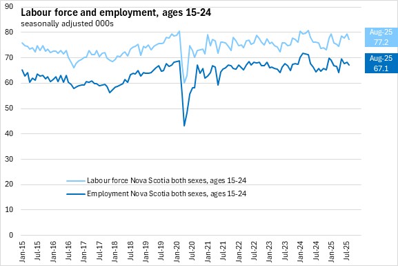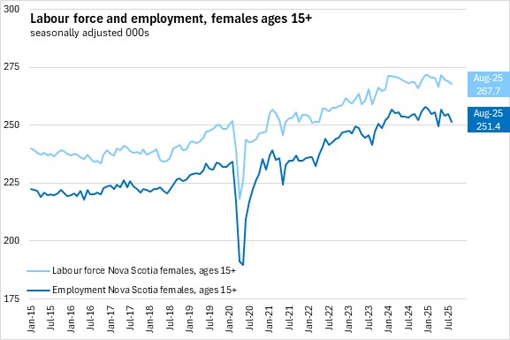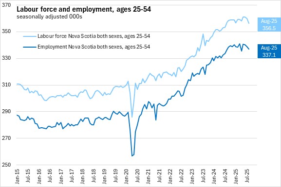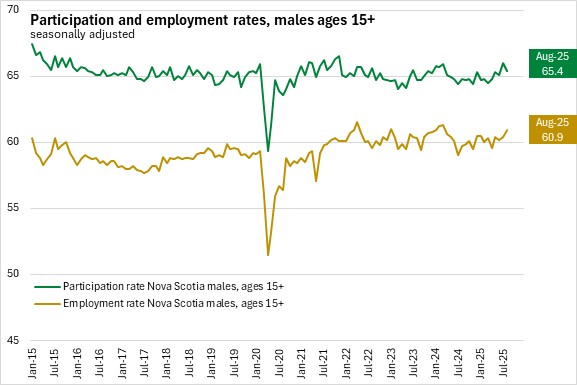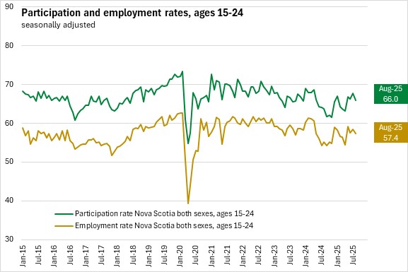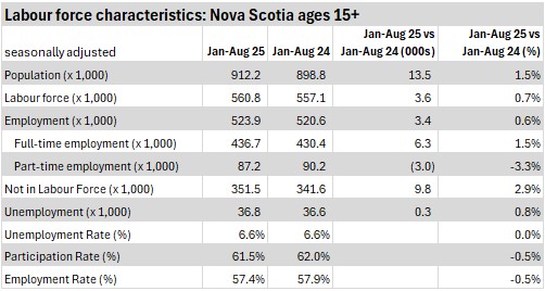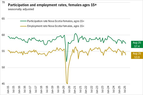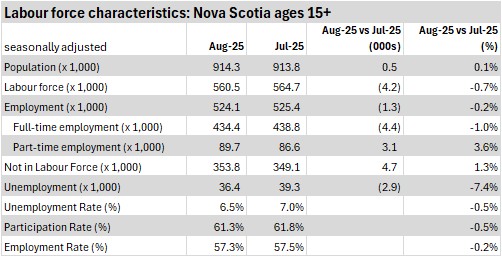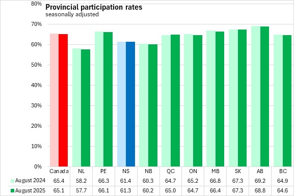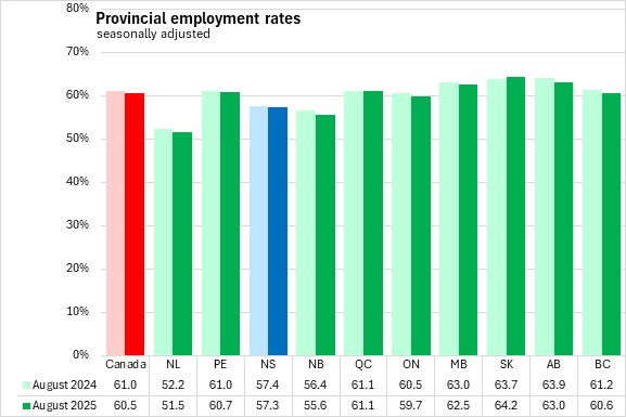 Nova Scotia's labour force participation rate declined 0.5 percentage points to 61.3% and the employment rate declined 0.2 percentage points to 57.3% in August 2025.