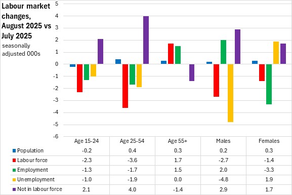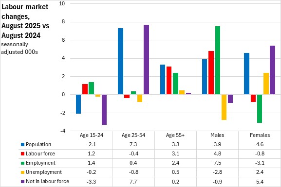 Age and sex cohorts (August 2025 vs August 2024, seasonally adjusted)