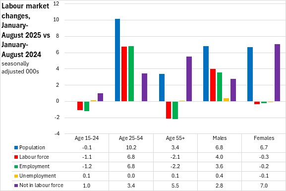 Compared with January-August 2024, labour force and employment growth was concentrated among core-aged workers (whose population is also growing more than others). Labour force growth was largely the same as employment growth for core-aged workers, resulting in no change in unemployment. Youth and older workers reported employment declines that outpaced labour force decline. Unemployment increased marginally for youth and older age cohorts and among males, with females reporting the only (marginal) decline in unemployment. Males reported growth in labour force outpacing employment, resulting in higher unemployment. Females reported a labour force decline that outpaced the employment decline, generating a smaller number of those reporting being unemployed. The number of females not in the labour force increased faster than the number of males not in the labour force, despite similar increases in population.