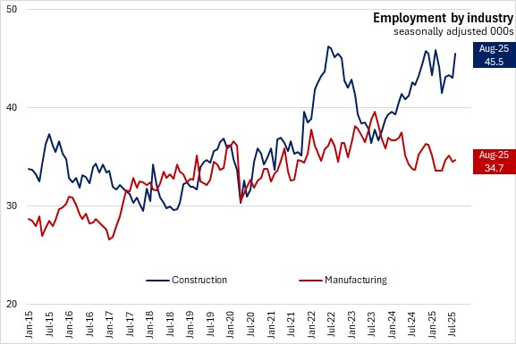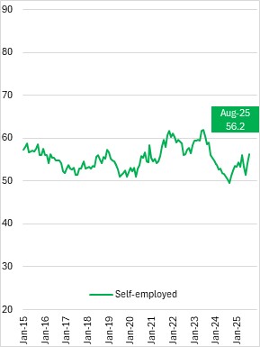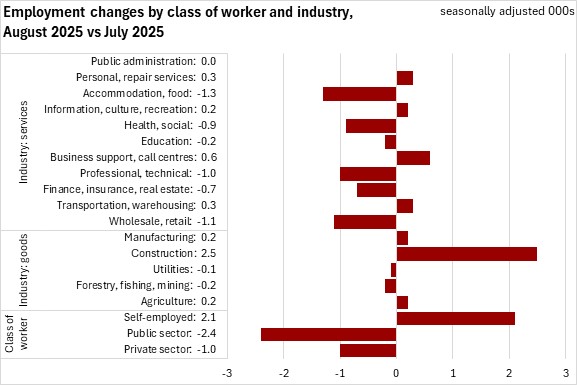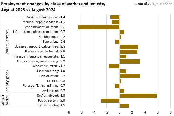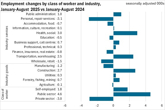 Compared to January-August 2024, gains were strongest for public sector workers (+4,600, +3.4%), with smaller gains in self employment (+1,800, +3.3%). There was a decline in private sector workers (-3,000, -0.9%).