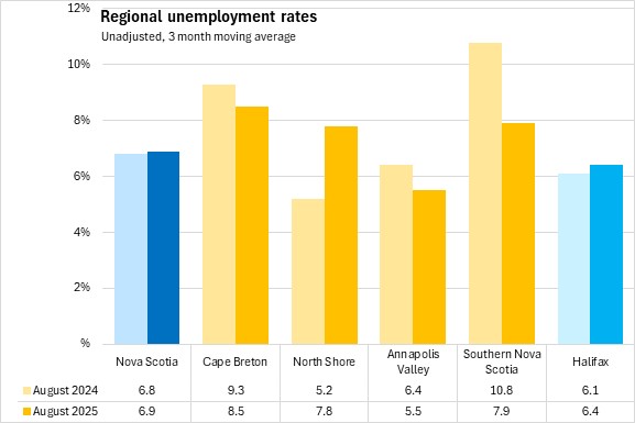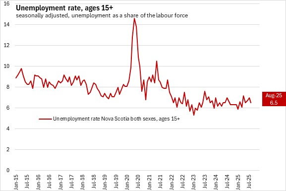 With labour force decreasing faster than employment, Nova Scotia's unemployment rate decreased 0.5 percentage points to 6.5% in August 2025.