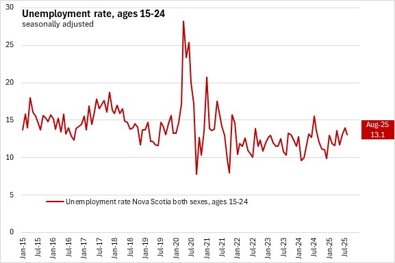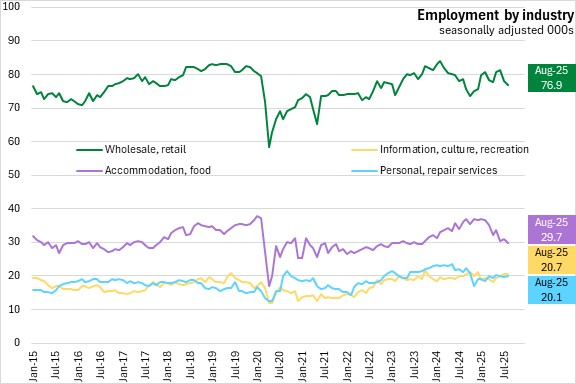 Among youth (ages 15-24), employment fell by 1,300 (-1.9%) while the labour force fell by 2,300 (-2.9%). As labour force fell faster than employment, the youth unemployment rate declined 0.9 percentage points to 13.1% in August 2025. The youth participation rate declined 1.8 percentage points to 66.0% while the youth employment rate decreased 1.0 percentage point to 57.4%.